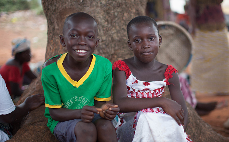 The image above shows children of members of SCINPA – a Fairtrade-certified cocoa-producing coop in Agboville, Ivory Coast. SCINPA has 2,500 members with farms mainly between 5 and 10 hectares. Their members earn around 90% of their income from cocoa and their harvests have recently been badly affected by climate change and drought. The coop is using Fairtrade premium payments for building schools, with the goal of eliminating child labor in the area.